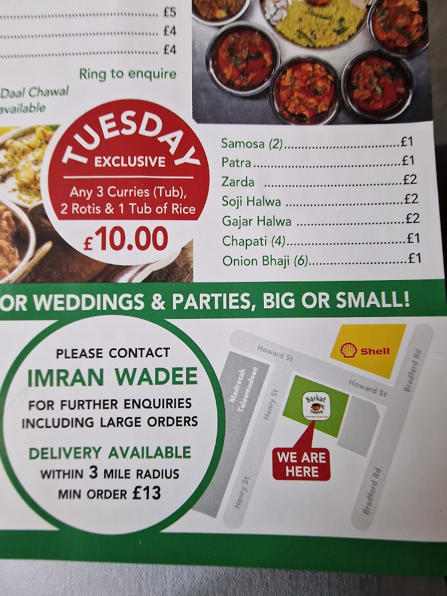 At Barkat Catering, located in Batley, UK, you’ll discover a delightful fusion of flavors guaranteed to satisfy any craving. Their menu features an array of authentic dishes, ranging from Aloo Paratha and Chapli Kebab to tantalizing curry options that have garnered rave reviews from customers like Chris Keech, who hails it as the "best curry" he's ever had.